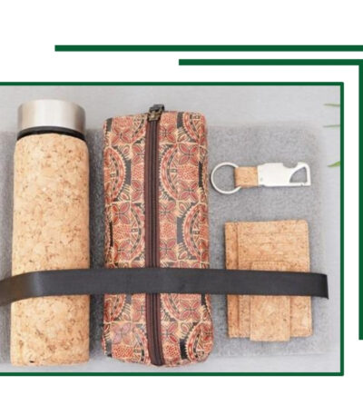This beautifully coordinated gift set contains a cork bottle for sustainable hydration, a stylish designer pouch, a practical cork card holder, and a metal and cork keychain. Perfect for those who value both eco-conscious gifts and aesthetic daily essentials, packaged for easy presentation.