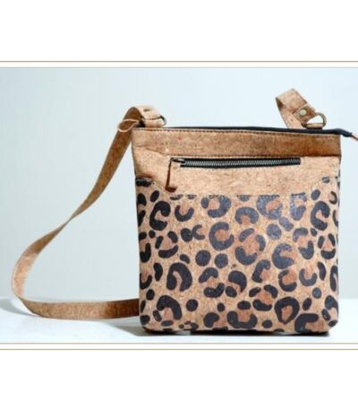 This fashionable crossbody purse combines natural cork with a bold leopard print pattern, creating a trendy accessory with multiple zip compartments for organization. The adjustable cork strap and compact design make it ideal for casual outings while the animal print adds contemporary fashion appeal to sustainable materials.