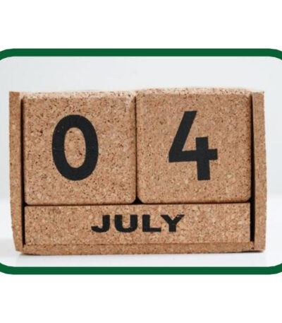 Three-piece cork perpetual calendar system displaying “04 JULY” with separate blocks for date numbers and month, mounted in natural cork base for reusable daily date display.