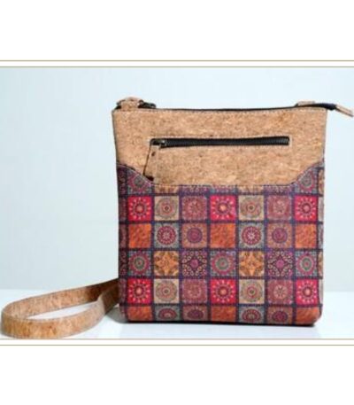 This stylish crossbody bag features vibrant Moroccan tile patterns in rich burgundy, coral, and earth tones combined with natural cork construction. The compact size and adjustable strap make it perfect for hands-free carrying while the artistic pattern and sustainable materials reflect both style and environmental consciousness.