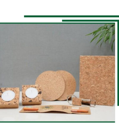 Includes two cork tea light holders, a pair of round cork coasters, a cork notebook, cork-grip pen, cork USB cable holder, and cork desk mat with decorative patterning for comprehensive workspace organization.