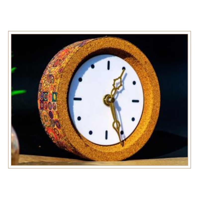 This eye-catching round wall clock features a stunning cork frame adorned with a vibrant mosaic-style pattern around the perimeter. The clean white clock face provides excellent contrast and readability, while the decorative cork border adds artistic flair and cultural charm to any room. The substantial cork construction ensures durability while the colorful pattern makes it a statement piece suitable for creative studios, offices, or contemporary living spaces seeking both function and artistic expression.