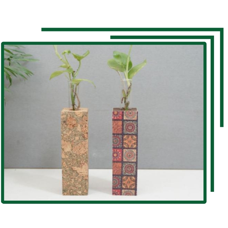 Each set contains two tall vases: one plain cork, one decorated block pattern, both with glass tubes for green plants. The vases provide vertical visual interest and sustainable flair to desks, shelves, or window displays.