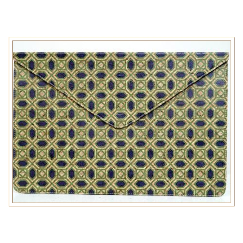 Contemporary Cork Envelope Clutch with Blue and Green Geometric Pattern for Modern Sustainable Fashion