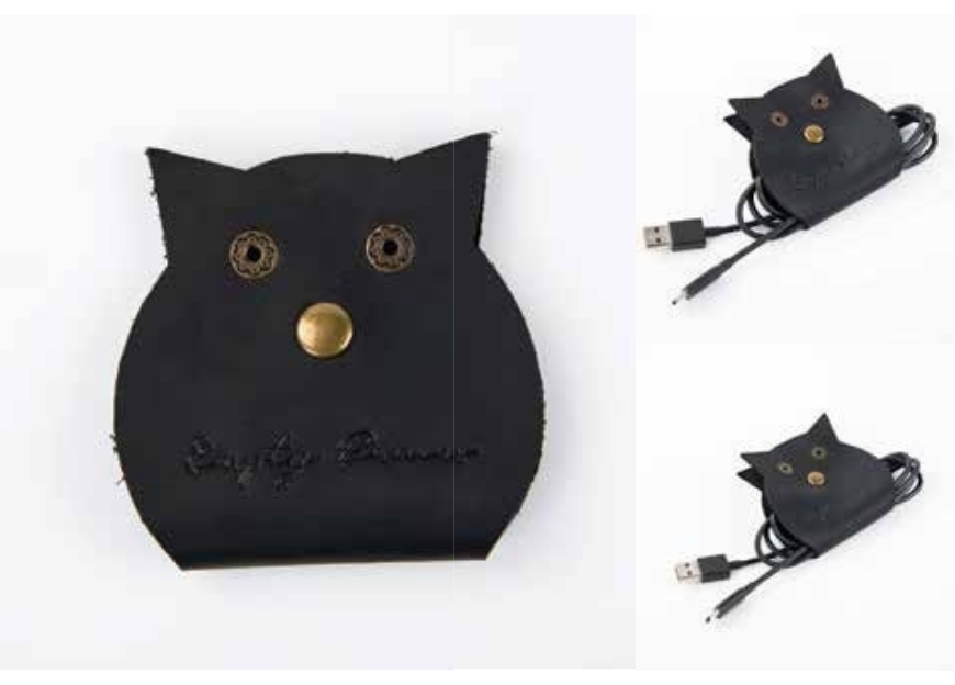 Organize charging cables and wires with flair using this adorable black faux leather cable organizer, crafted in a playful cat-face shape with metallic snap closure for secure bundling. It keeps cords tangle-free and features distinct stitching and eyelet accents, making it both a practical and delightful accessory for desks or travel bags. 100% made in India, this creative product supports local artisans while adding charm to everyday organization