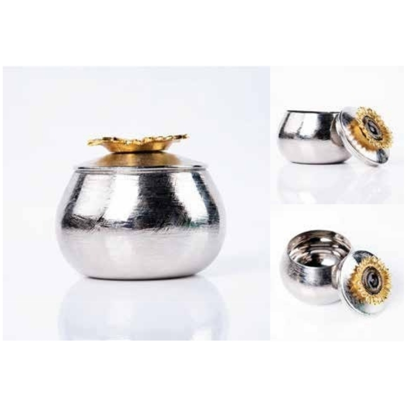 Be the first to review “Decorative Silver Storage Jar with Embossed Gold Sunflower Lid for Festive or Everyday Use – 100% Made in India” Cancel reply