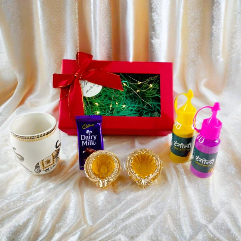 Kappa Box , 2 Terracotta Diya , 2 RangoliColor , 1 Ceramic Kullhad, 1 Dairy Milk Chocolate 11g