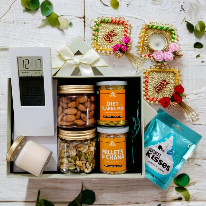Kappa Box, Hanging Shubh Labh with T-Light Candle, Digital Table Clock, Almonds 100g Pet Jar, Mix Seeds wit Nut’s 100g Pet Jar, Millet’s & Chana 30g, Diet Flakes Mix 45g, Hershey’s Chocolate 33.3g, Scanted Glass Candle