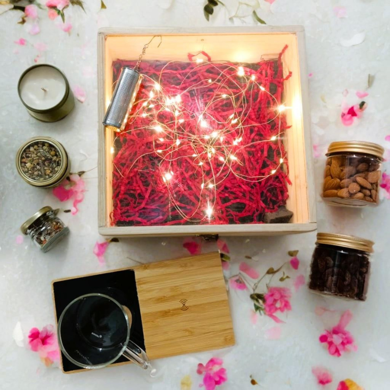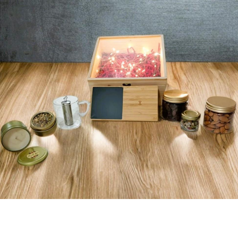 Pine wood box , Bamboo Wireless charger with cup warmer , 1 Borosilicate Glass 190ml , Metal Tea Diffuser , Tea Assortment tin 20g , Scented Candle in tin , Mukhwas in small jar , Almond in pet jar 100g , Raisin in pet jar 100g
