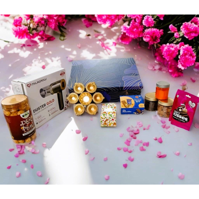 Kappa Box , Vacuum Cleaner , PeriPeriFoxnut70g , Metal Urli, sweetBarfi96g , Hershey’s Chocolate33.3g , Sweet delight 5 sachet 25g , Almond in pet jar 100g , Raisin in pet jar 100g , Scented Glass candle
