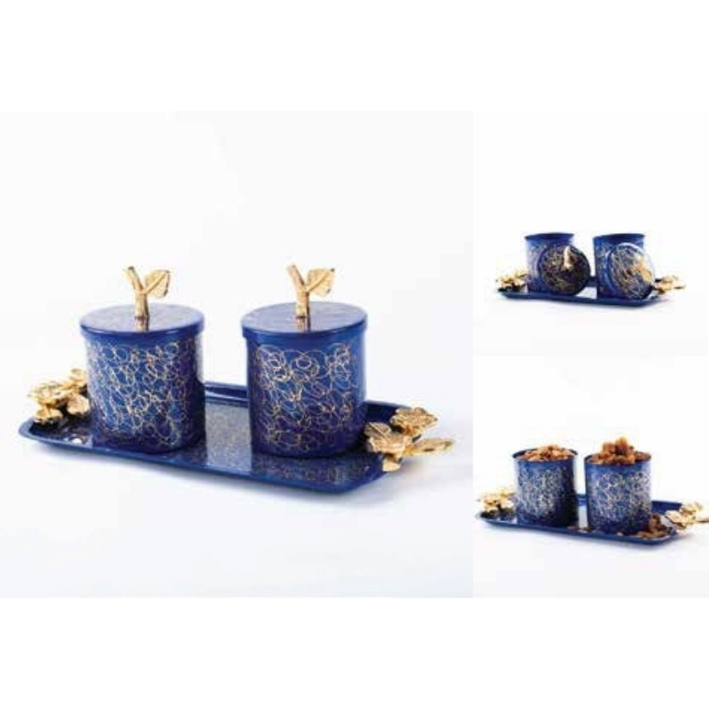 This exquisite set features two rich royal blue jars, each adorned with an intricate golden floral swirl pattern and finished with ornate golden leaf handles. The jars rest on a matching blue tray highlights golden flowers, making it perfect for serving dry fruits, sweets, or condiments during festive gatherings or everyday use. Every detail is crafted by skilled Indian artisans, ensuring it is 100% made in India.