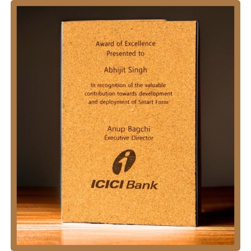 This distinguished award, signed by Executive Director Anup Bagchi, honors Abhijit Singh for his valuable contribution toward the advancement and successful implementation of the Smart Form initiative at ICICI Bank. The recognition celebrates dedication, innovation, and positive impact in supporting banking technology and customer service enhancements, showcasing exemplary performance in driving key developmental projects within the organization.