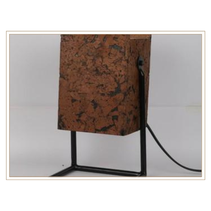 This lamp features a robust square cork block elevated on a sleek black metal frame, combining eco-friendly materials with industrial style. Its contemporary look and sturdy construction make it suitable for both home and professional environments, enhancing urban aesthetics.