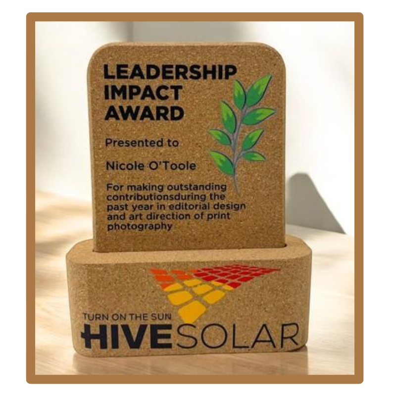 This award recognizes Nicole O’Toole for her exceptional contributions over the past year in editorial design and art direction of print photography. Presented by Hive Solar, the Leadership Impact Award celebrates distinguished achievements in creative leadership, innovation, and vision. The plaque features vibrant leaf and solar motifs, symbolizing growth, sustainable energy, and creative inspiration, reflecting Hive Solar’s commitment to excellence and progress.