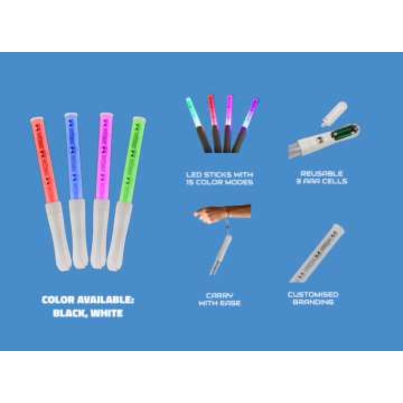 These advanced LED glow sticks provide up to 15 color modes, with bright tips shown in several hues, white bases, and convenient carrying loops. Great for parties, raves, concerts, and sporting events, they combine easy activation with reusable battery power and individualized branding to match the theme or sponsor requirements.
