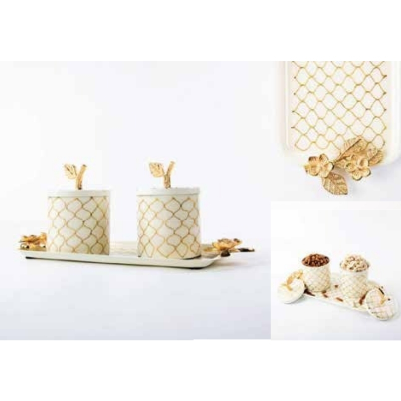 Luxury Ivory Storage Jar Set with Intricate Golden Lattice Detailing and Floral Decor on Serving Tray – 100% Made in India