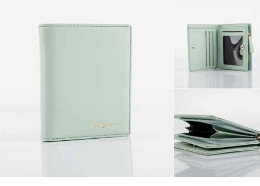 This pastel mint compact wallet combines elegance with practical functionality, featuring a zippered coin pocket, multiple card slots, and a transparent ID window for easy access. The bi-fold design allows for efficient organization without bulk, and the subtle gold logo reflects refined style suitable for any occasion. Proudly 100% made in India, this wallet blends classic appeal with expert local artistry.