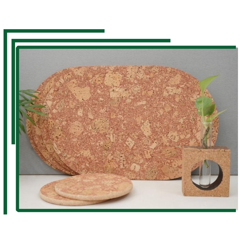 This versatile set includes a large oval cork mat, several coordinated round cork coasters, and a distinctive square cork vase with plant. Designed for both practical utility and modern eco-friendly décor, it fits dining, serving, or personal spaces.