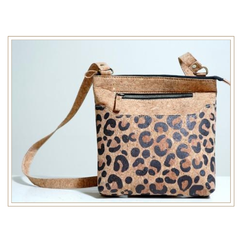 This fashionable crossbody purse combines natural cork with a bold leopard print pattern, creating a trendy accessory with multiple zip compartments for organization. The adjustable cork strap and compact design make it ideal for casual outings while the animal print adds contemporary fashion appeal to sustainable materials.