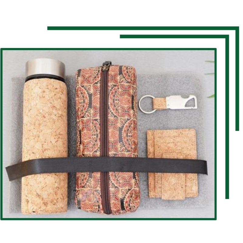This beautifully coordinated gift set contains a cork bottle for sustainable hydration, a stylish designer pouch, a practical cork card holder, and a metal and cork keychain. Perfect for those who value both eco-conscious gifts and aesthetic daily essentials, packaged for easy presentation.
